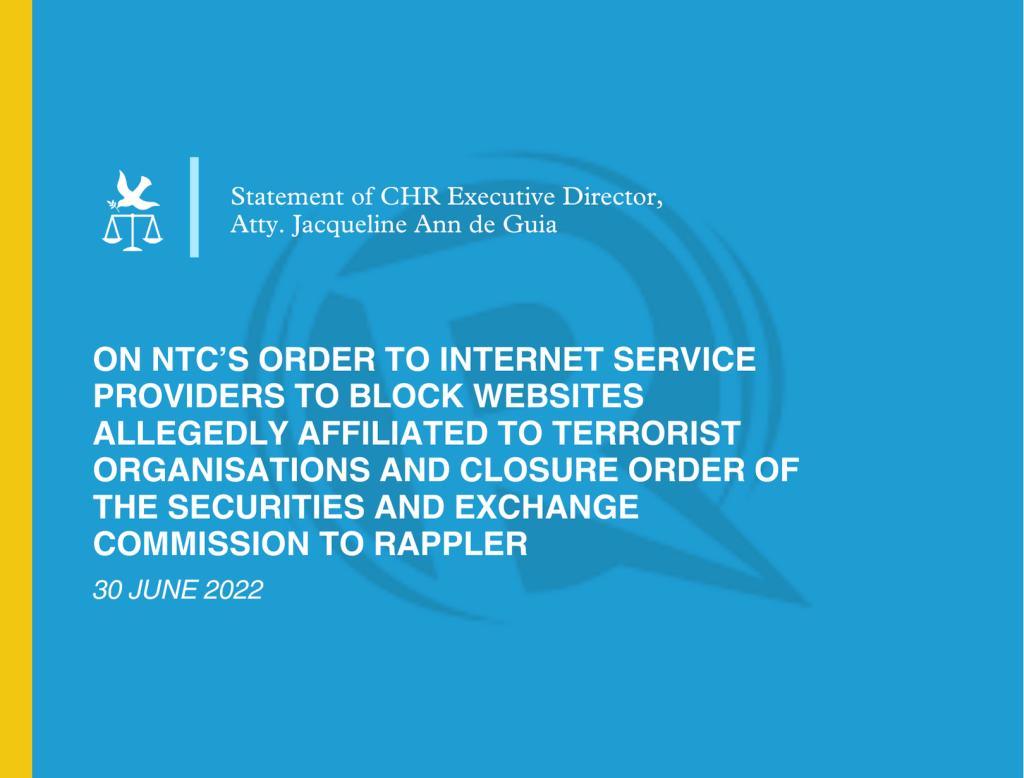 Statement of CHR Executive Director, Atty Jacqueline Ann de Guia, on NTC’s order to internet service providers to block websites allegedly affiliated to terrorist organisations and closure order of the Securities and Exchange Commission to Rappler