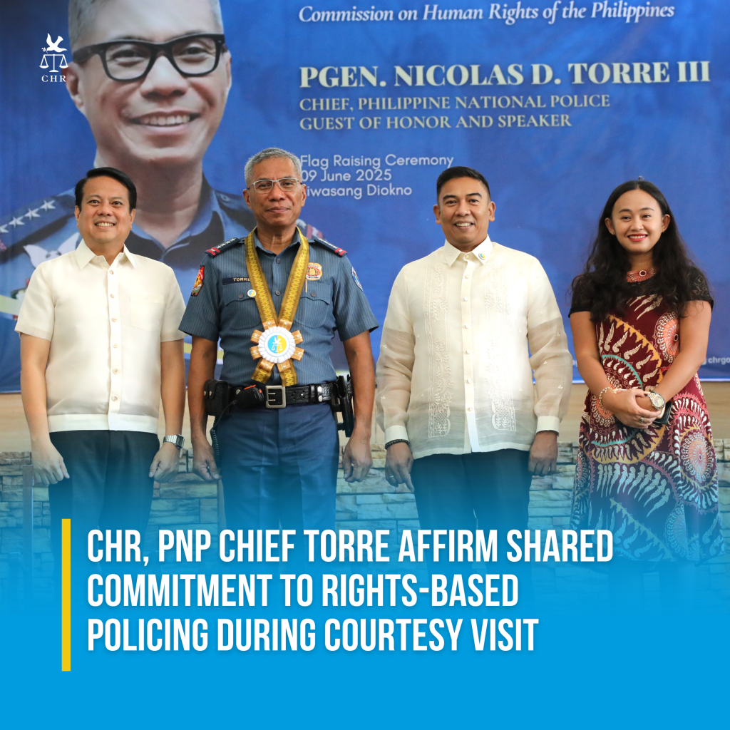 In a landmark gesture of collaboration to uphold the dignity of every Filipino, the Commission on Human Rights (CHR) welcomed newly appointed Philippine National Police (PNP) Chief, Police General Nicolas Torre III, during its flag raising ceremony held at Liwasang Diokno on 09 June 2025. CHR Chairperson Richard P. Palpal-latoc, together with Commissioners Beda A. […]
