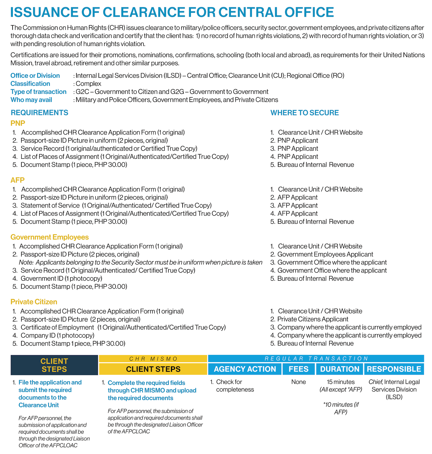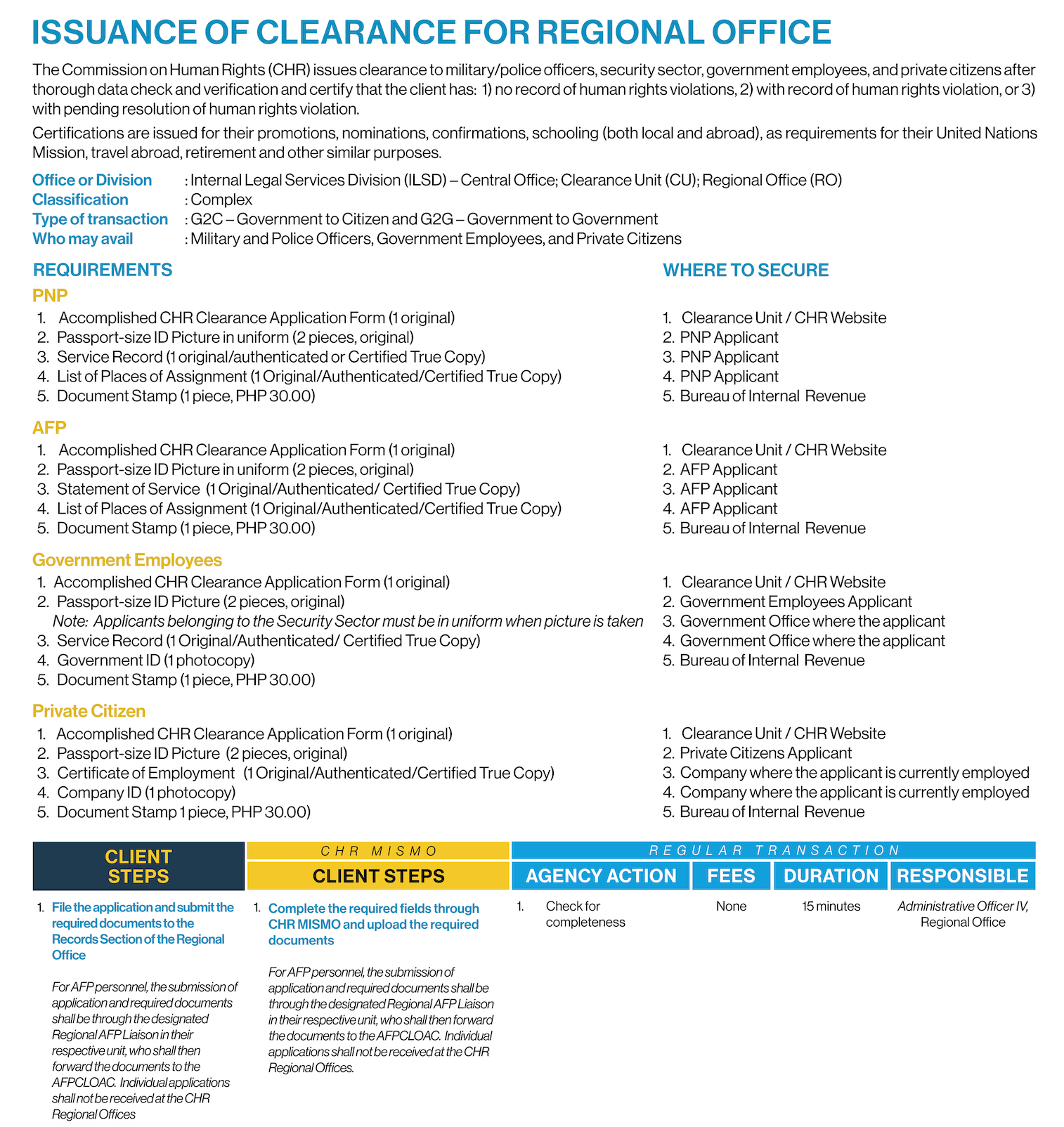 Issuance of CHR Clearance HomeIssuance of CHR Clearance DOWNLOAD APPLICATION FOR CHR CLEARANCE / CERTIFICATION FOR INQUIRIES:Clearance Unit ✉️ clearanceunit@chr.gov.ph (02) 8282-1877 0968 683 7165 (Smart)